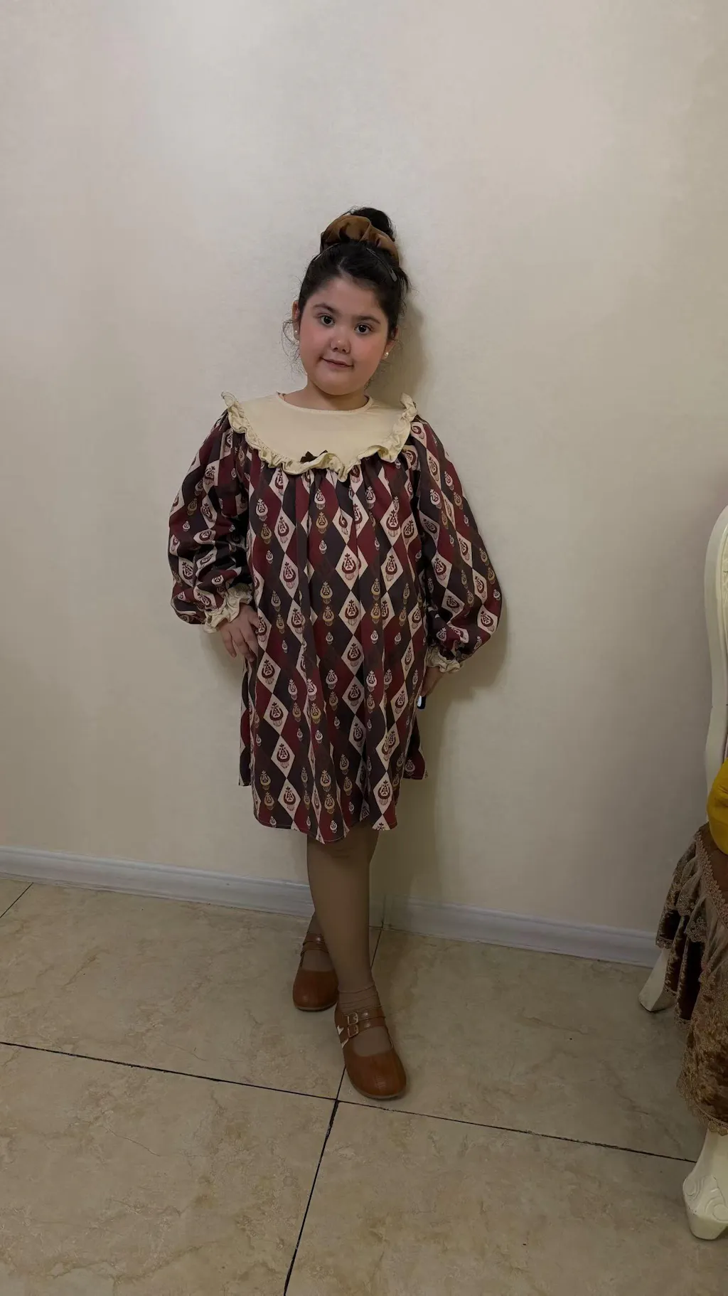 A charming vintage-style dress featuring a unique atlas diamond pattern and a soft ruffled collar with a delicate bow detail. The loose, comfortable fit makes it perfect for everyday wear or special occasions. Designed with a blend of culture and elegance, bringing timeless beauty to your little one’s wardrobe.